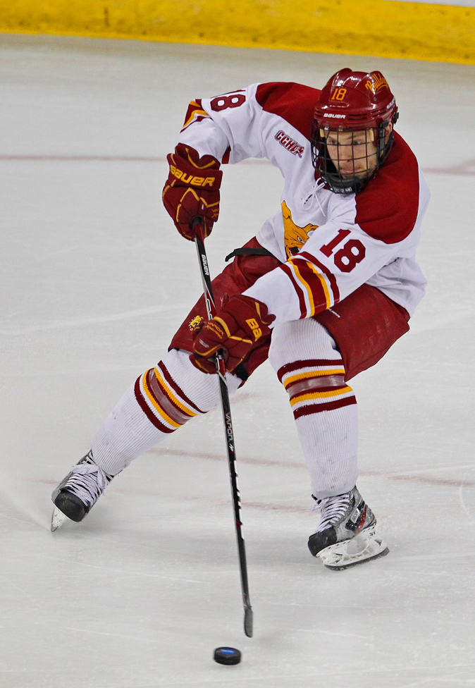 Ferris State’s Andy Huff moves the puck past Denver’s Scott Mayfield during the first period.