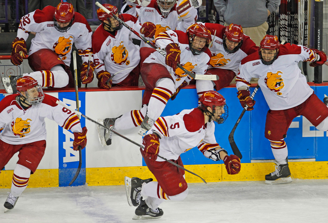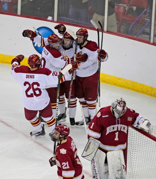 Ferris State players celebrate after scoring a goal against Denver during the third period.