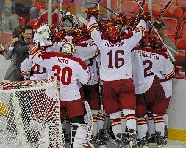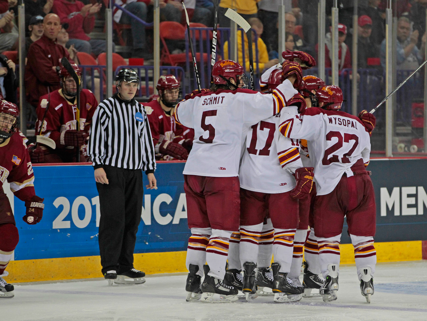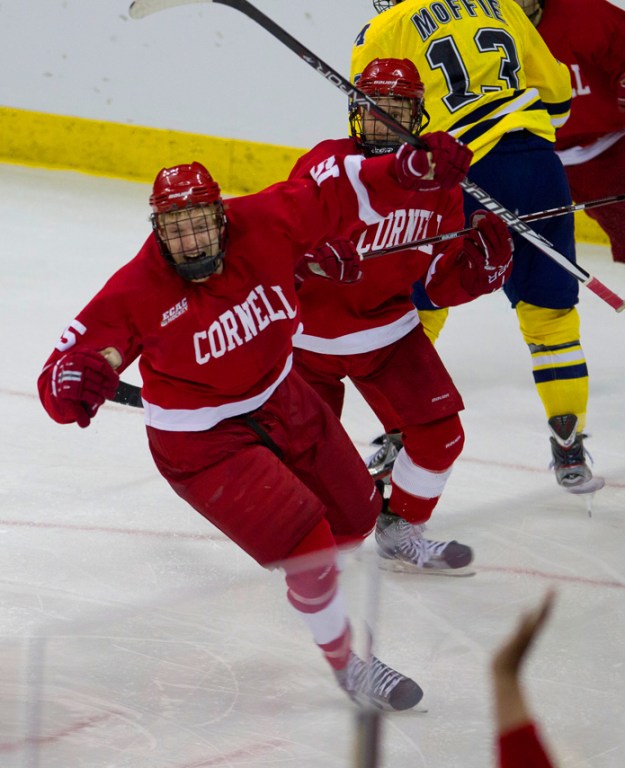 Michigan players celebrate after scoring a goal against Cornell during the first period.