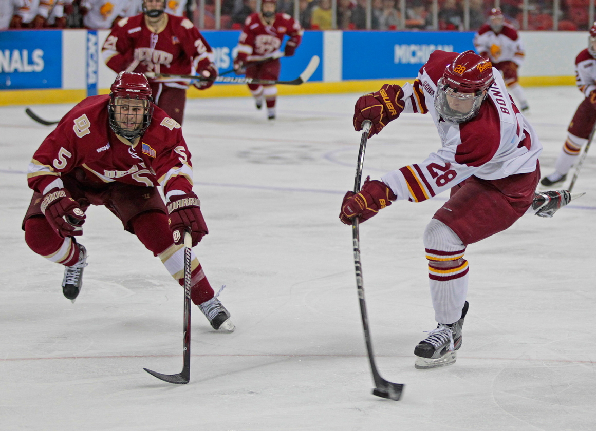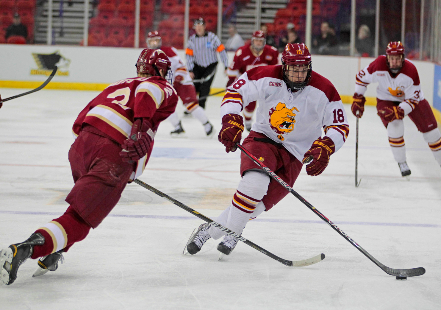 Ferris State’s Kyle Bonis shoots the puck while being defended by Denver’s John Lee during the third period.