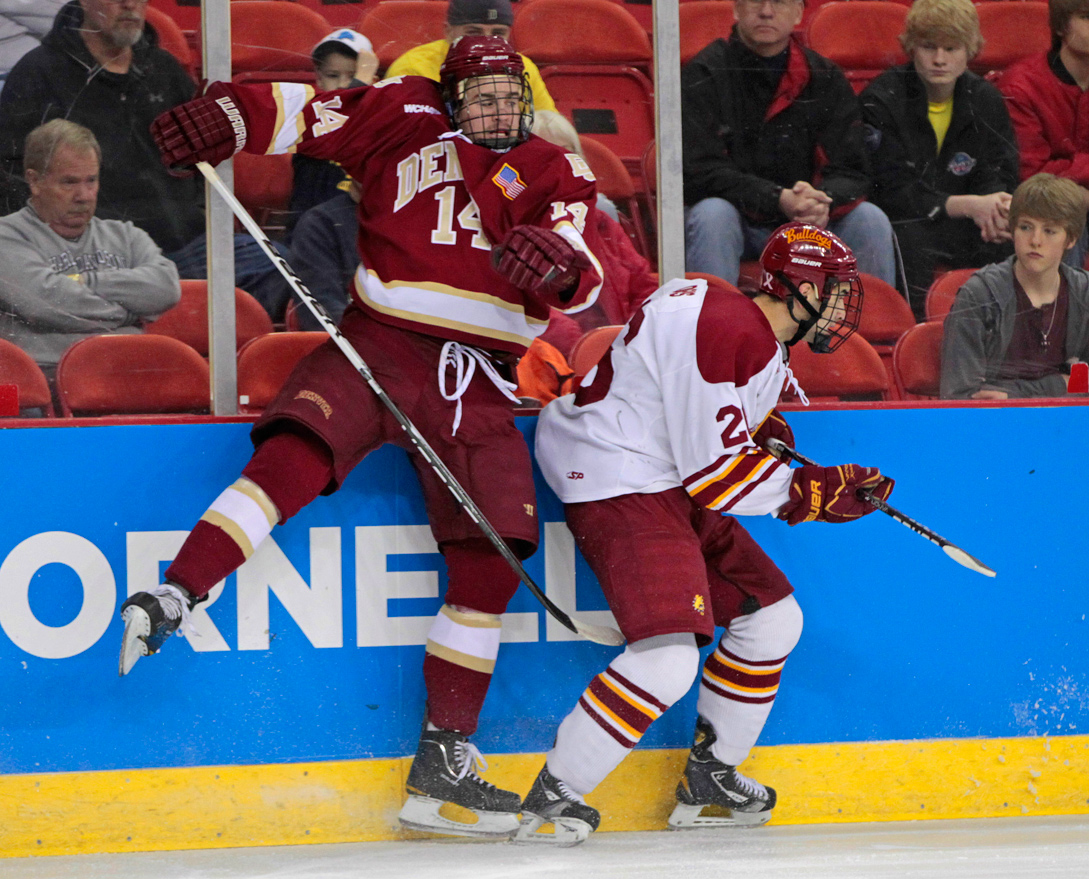 Ferris State’s Simon Denis and Denver’s Larkin Jacobson work for the puck during the first period.