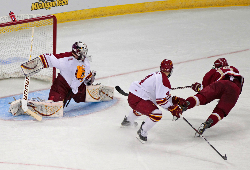 Ferris State’s Jordie Johnston (11) scores against Denver during the second period.