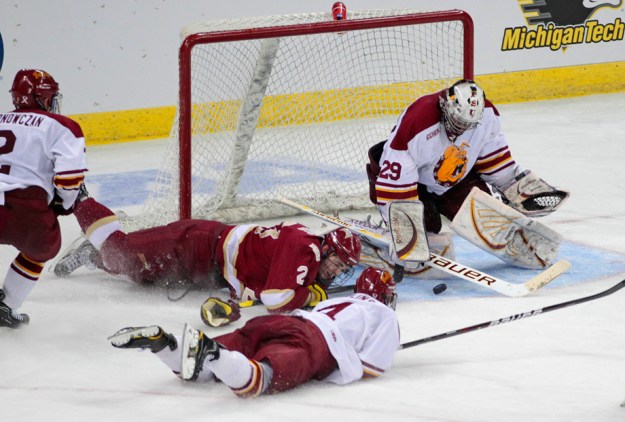 Cornell’s goaltender Andy Iles watches a puck go in the net shot by Ferris State’s Jordie Johnston during the third period.