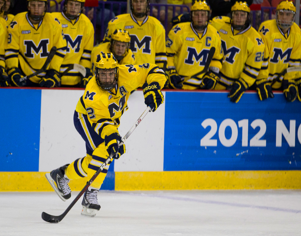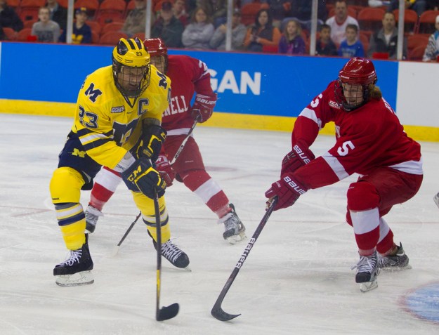Michigan’s Greg Pateryn looks to pass the puck against Cornell during the second period.