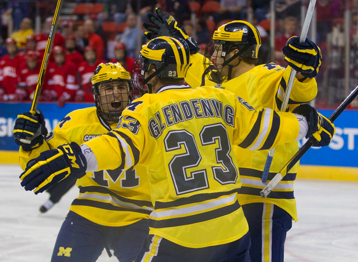 Michigan’s Luke Glendening scores while being defended by Cornell’s Joakim Ryan and Dustin Mowrey during the first period.