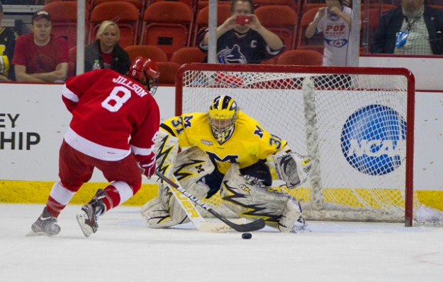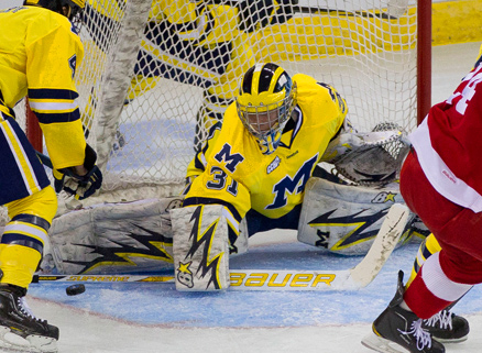 Michigan’s Shawn Hunwick makes a save against Cornell during the first period.