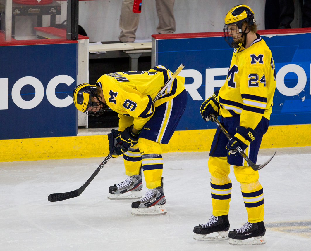 Michigan’s Luke Moffatt (9) and Jon Merrill skate off the ice after being defeated by Cornell in overtime.