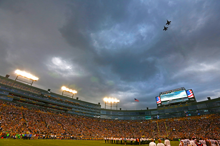 Two Navy F-18 fighters fly over Lambeau Field prior to the start of an NFL pre season football game between the Green Bay Packers and Cleveland Browns.