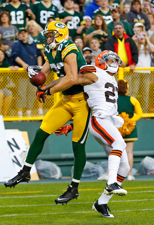 Green Bay Packers wide receiver Jordy Nelson makes a catch for a touchdown while being covered by Cleveland Browns defensive back Joe Haden.