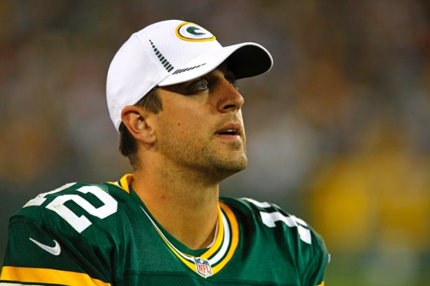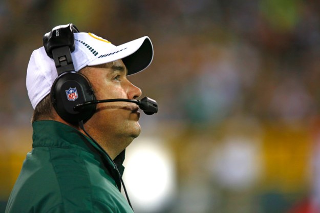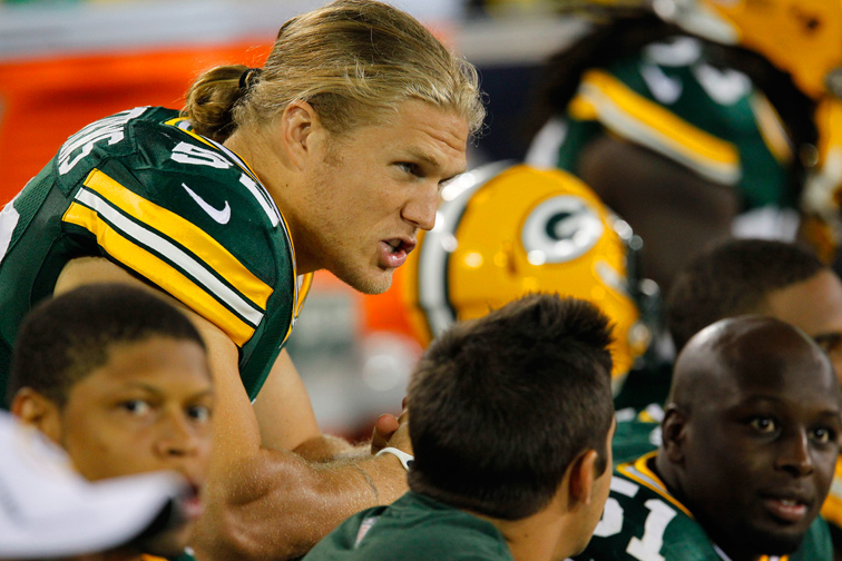 Green Bay Packers linebacker Clay Matthews talks with teammates on the sidelines.