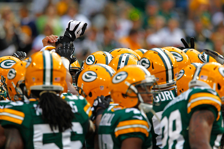 Green Bay Packers players huddle together prior to the start of an NFL pre season football game against the Cleveland Browns.