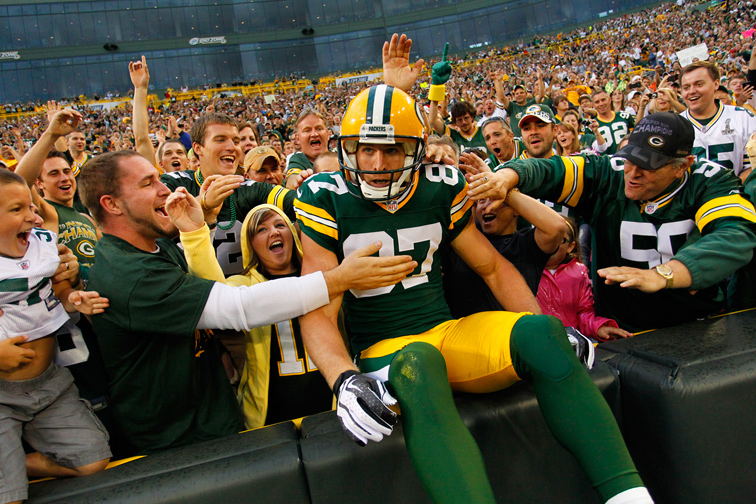 Green Bay Packers wide receiver Jordy Nelson leaps into the stands after scoring a touchdown against the Cleveland Browns.