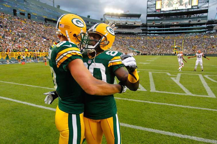Green Bay Packers wide receiver Jordy Nelson (87) and wide receiver Donald Driver (80) celebrate after scoring a touchdown against the Cleveland Browns.