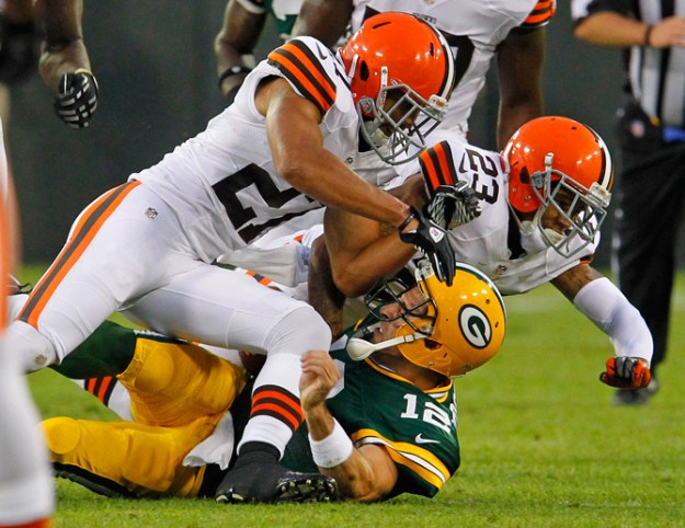 Green Bay Packers quarterback Aaron Rodgers is hit during a play by Cleveland Browns defensive back Eric Hagg (27) and defensive back Joe Haden (23).