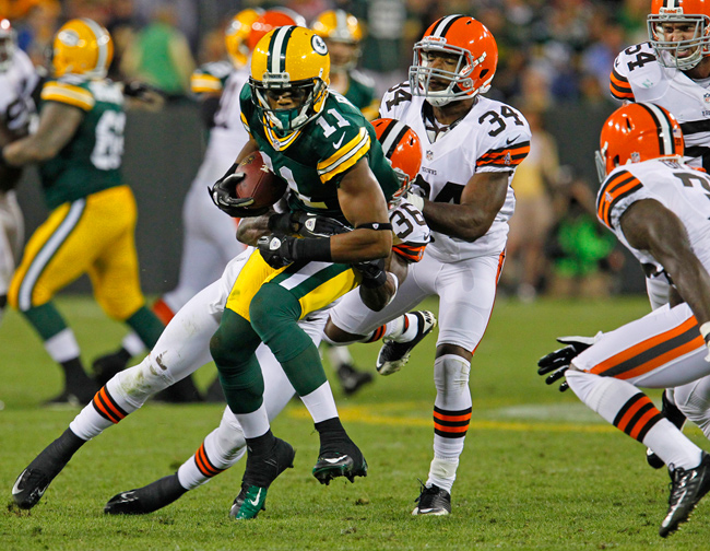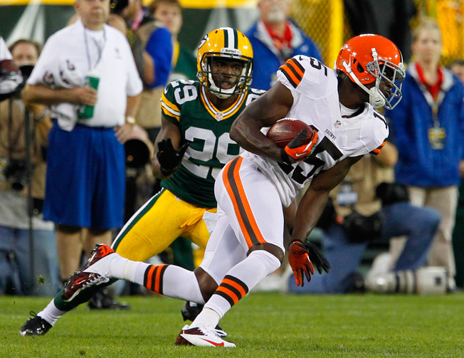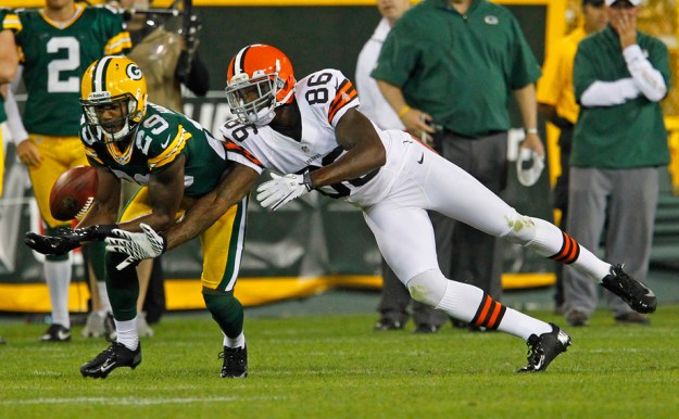 Cleveland Browns wide receiver Greg Little runs after making a catch while being covered by Green Bay Packers cornerback Casey Hayward.