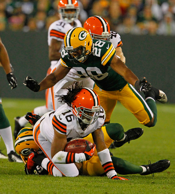 Cleveland Browns wide receiver Josh Cribbs is hit during a play by Green Bay Packers safety Sean Richardson (28) and linebacker Rob Francois (49).