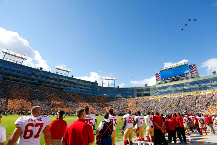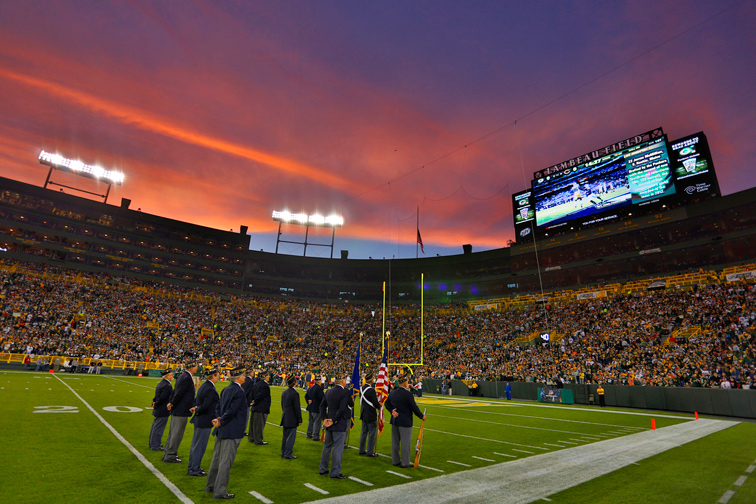 The sun sets over Lambeau Field prior to the start of an NFL football game between the Green Bay Packers and Chicago Bears.
