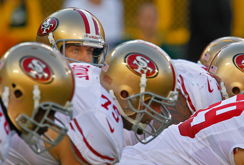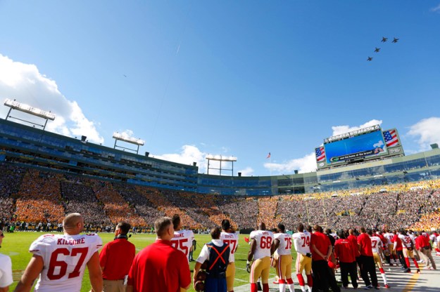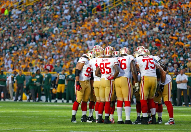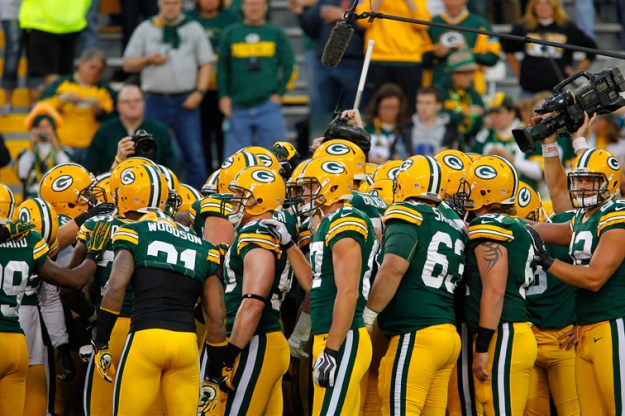 Green Bay Packers players huddle up prior to an NFL football game against the Chicago Bears.
