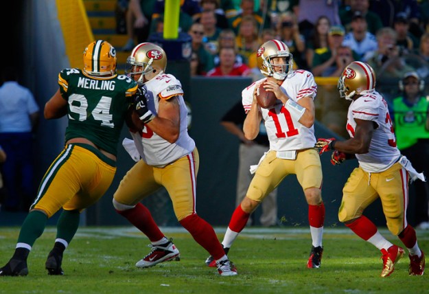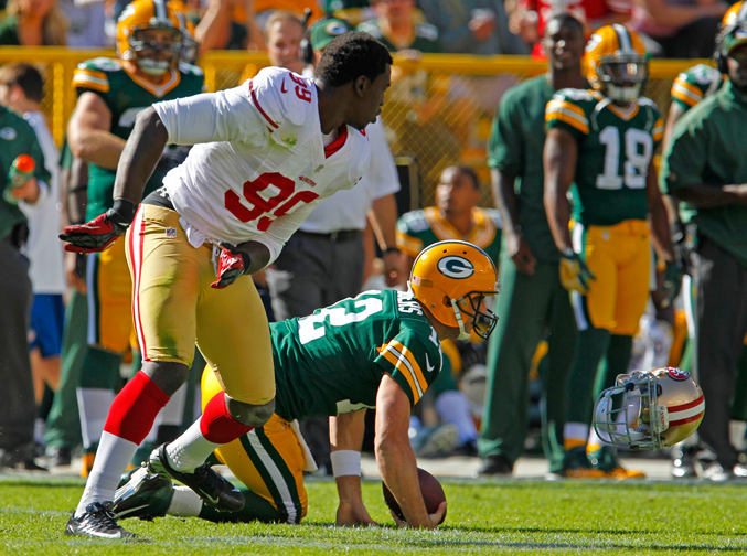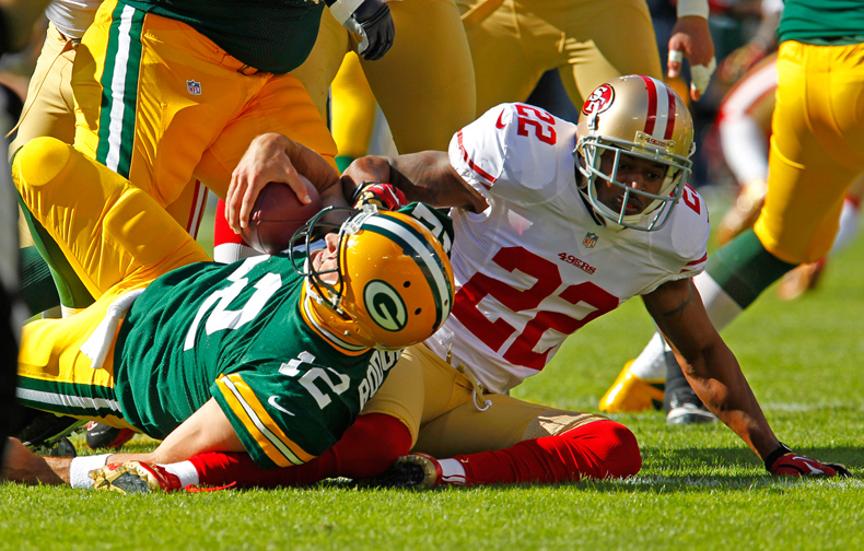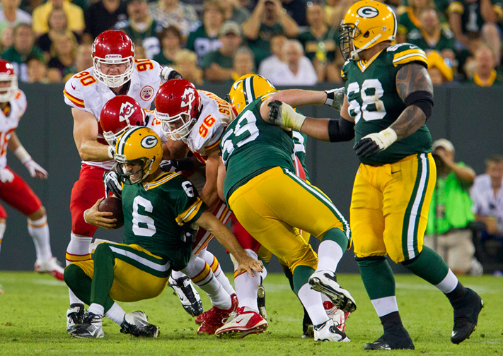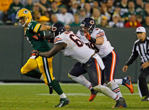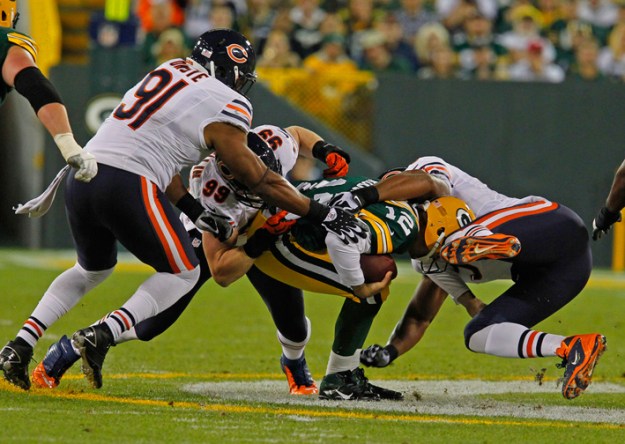 Green Bay Packers quarterback Aaron Rodgers is sacked by Chicago Bears defensive tackle Amobi Okoye (91) defensive end Shea McClellin (99) and defensive end Corey Wootton (98).
