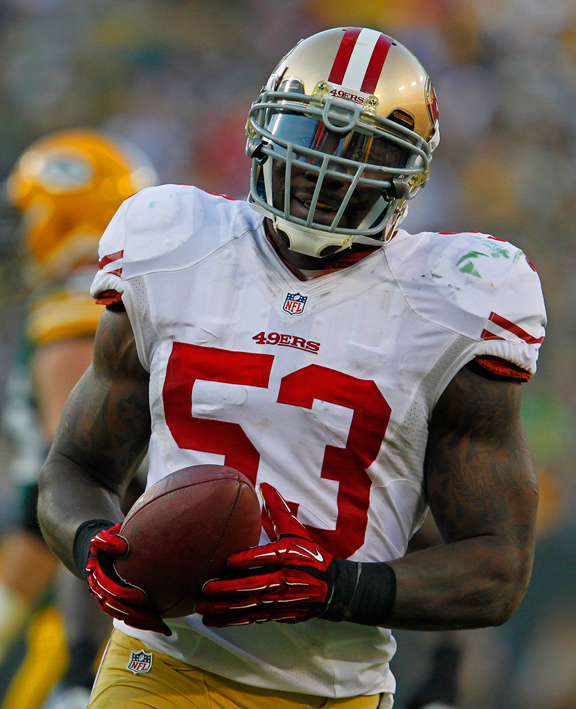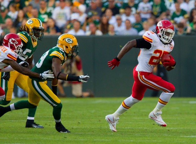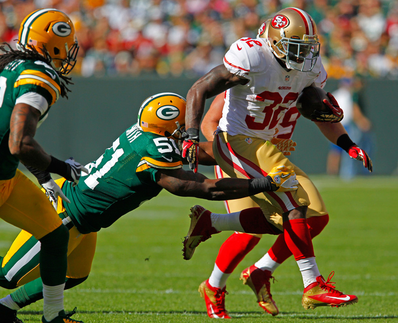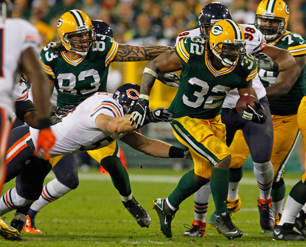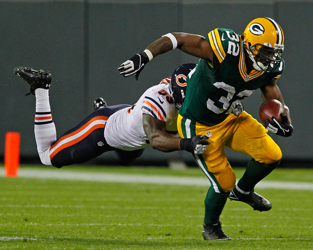 Green Bay Packers running back Cedric Benson rushes with the ball past Chicago Bears middle linebacker Brian Urlacher.
