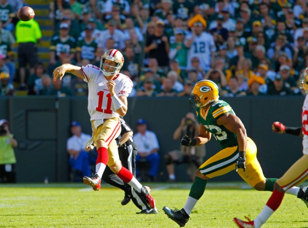 Green Bay Packers strong safety Charles Woodson dives to try to intercept a pass against the Chicago Bears.