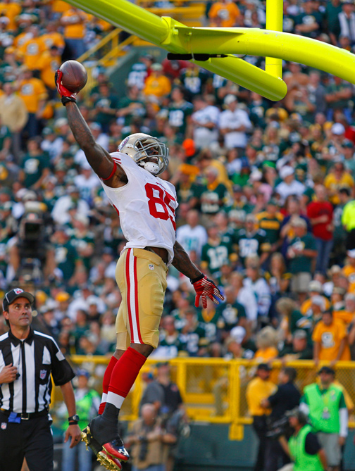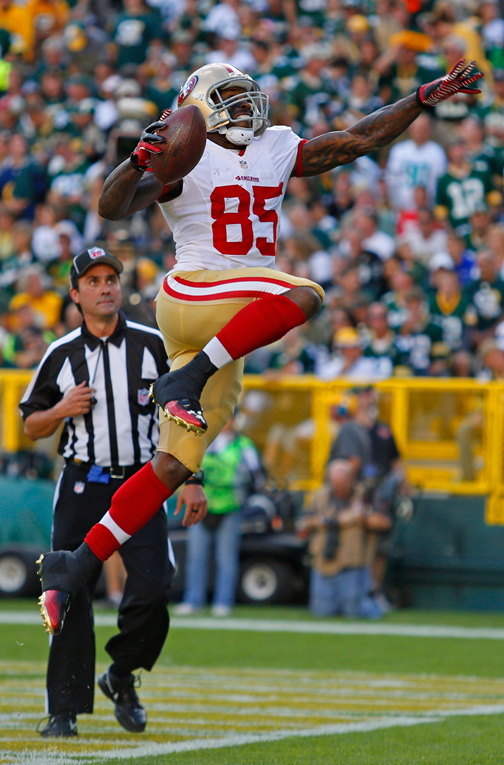 Green Bay Packers wide receiver Donald Driver scores a touchdown while being covered by Chicago Bears free safety Chris Conte.