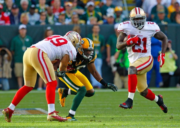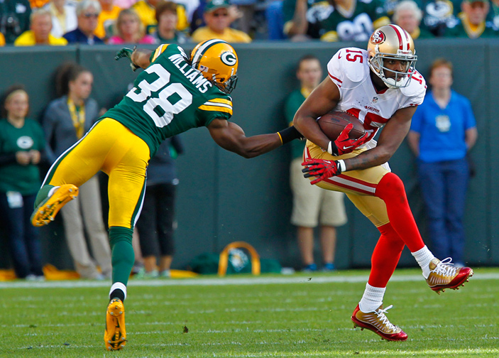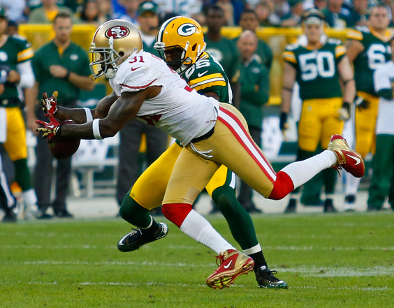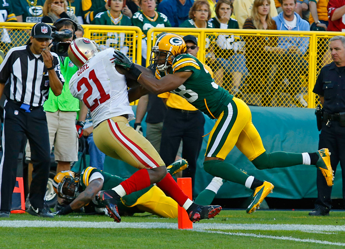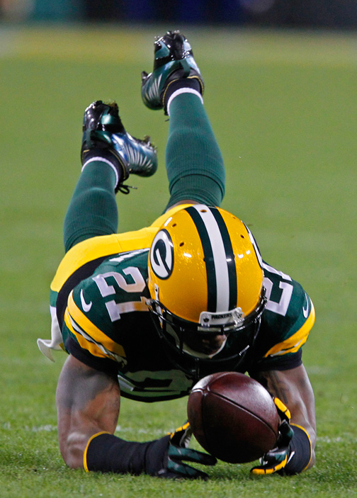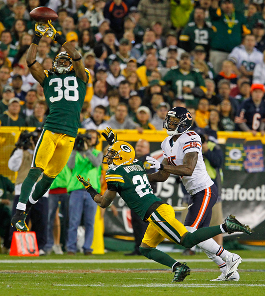 Green Bay Packers cornerback Tramon Williams intercepts a pass intended for Chicago Bears wide receiver Earl Bennett.