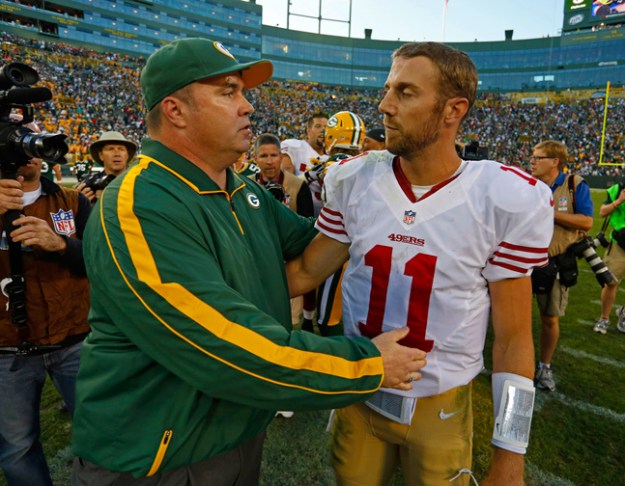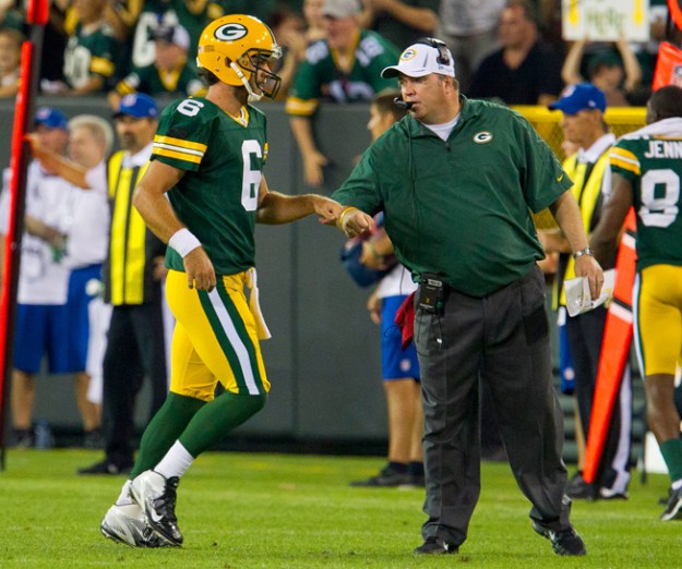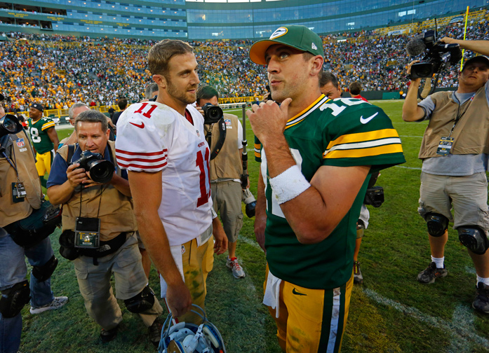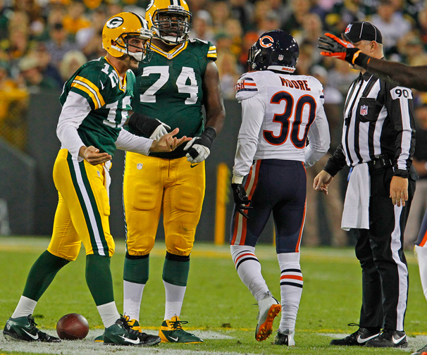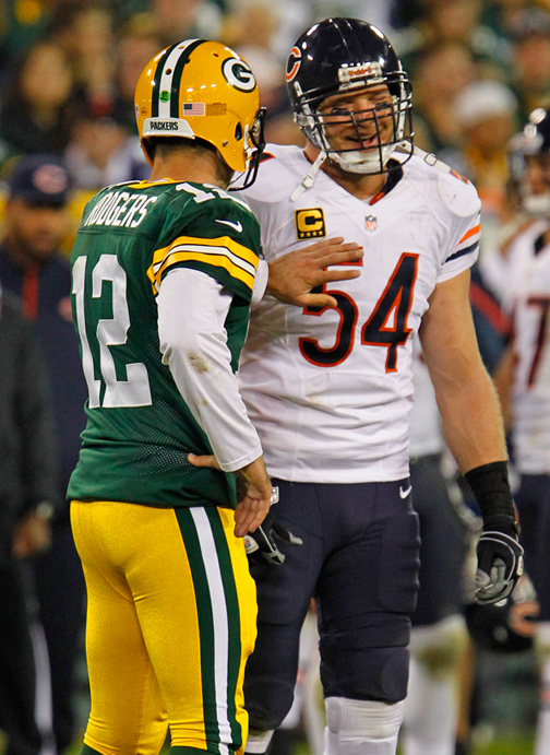 Green Bay Packers quarterback Aaron Rodgers talks in-between plays with Chicago Bears middle linebacker Brian Urlacher.