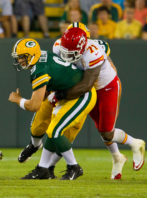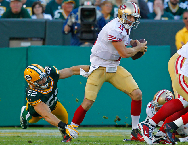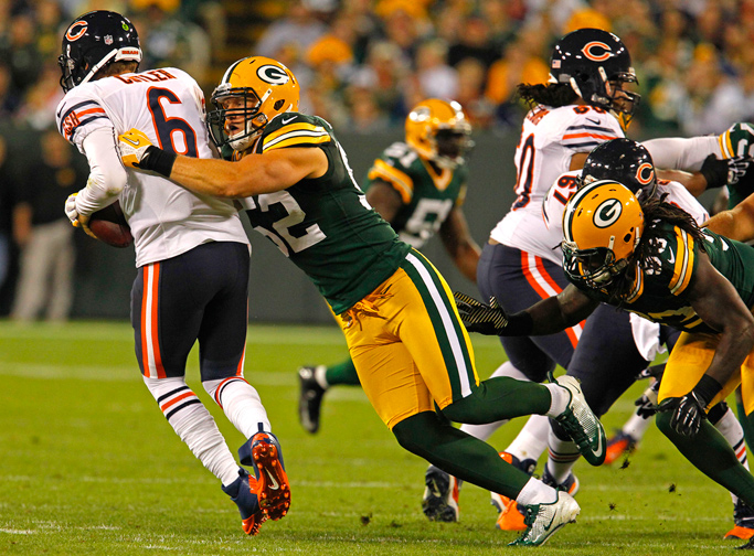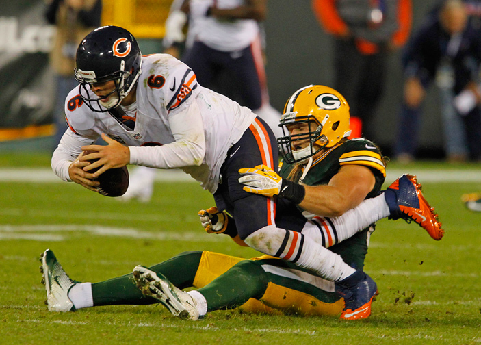 Green Bay Packers outside linebacker Clay Matthews sacks Chicago Bears quarterback Jay Cutler.