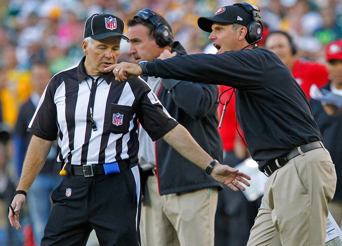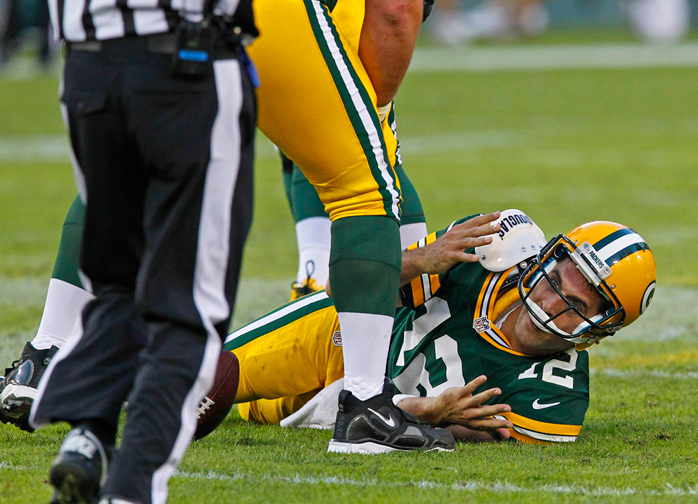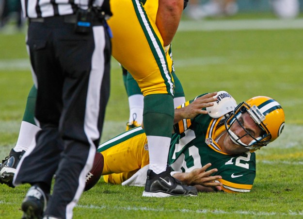 Green Bay Packers quarterback Aaron Rodgers yells to an official after being sacked by the Chicago Bears.