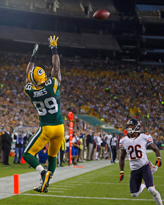 Green Bay Packerswide receiver James Jones jumps to try to make a catch in the end zone while being covered by Chicago Bears cornerback Tim Jennings.