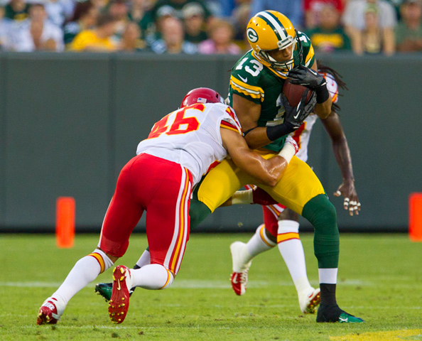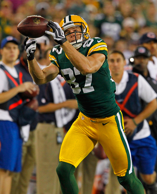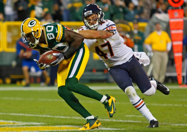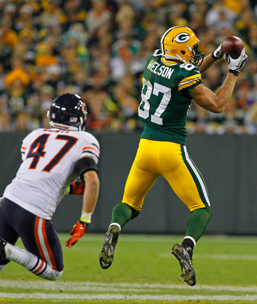 Green Bay Packers wide receiver Jordy Nelson makes a catch while being covered by Chicago Bears free safety Chris Conte.