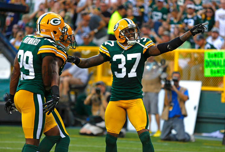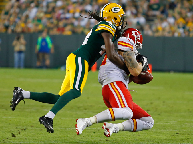 Green Bay Packers Tramon Williams jumps to intercept a pass intended for Chicago Bears wide receiver Brandon Marshall.