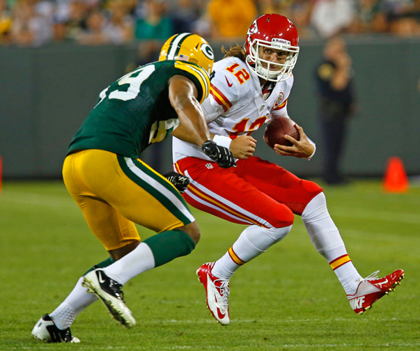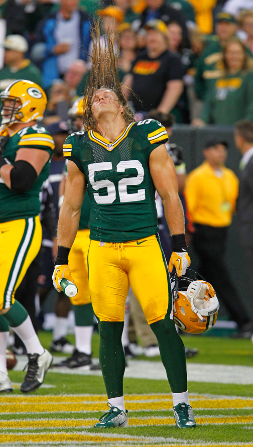 Green Bay Packers outside linebacker Clay Matthews flips back his hair.