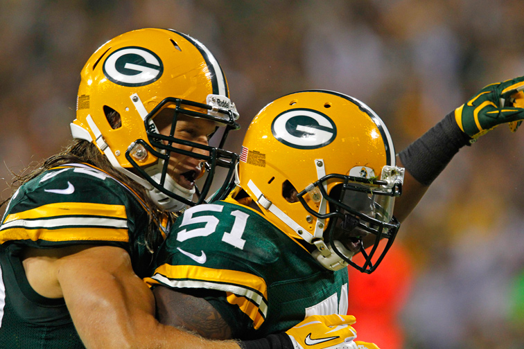 Green Bay Packers inside linebacker D.J. Smith (51) and outside linebacker Clay Matthews (52) celebrate a sack against the Chicago Bears.