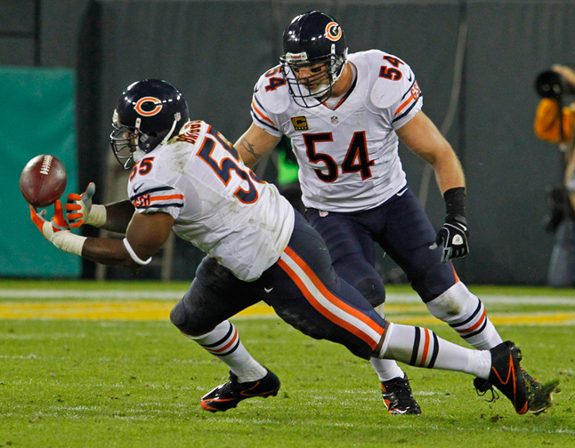 Chicago Bears outside linebacker Lance Briggs attempts to intercept a pass.