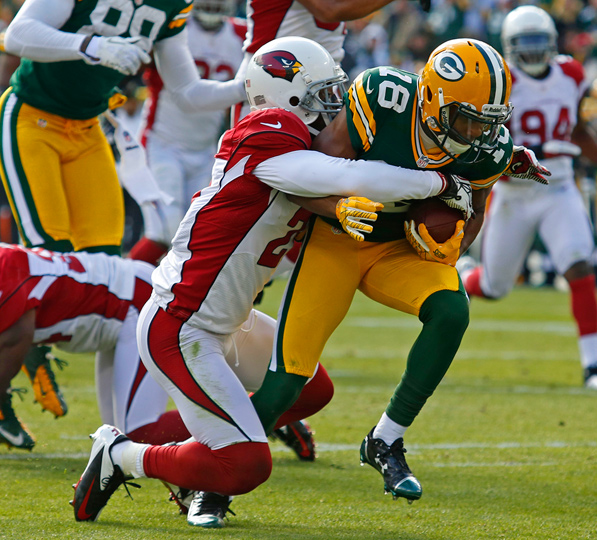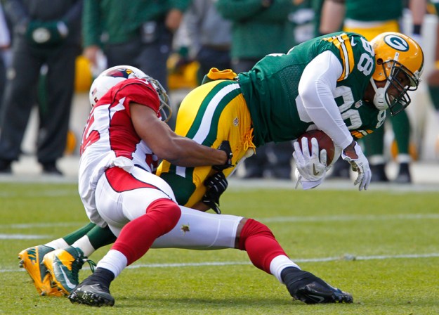 Green Bay Packers tight end Jermichael Finley is hit by Arizona Cardinals free safety Kerry Rhodes after making a catch.