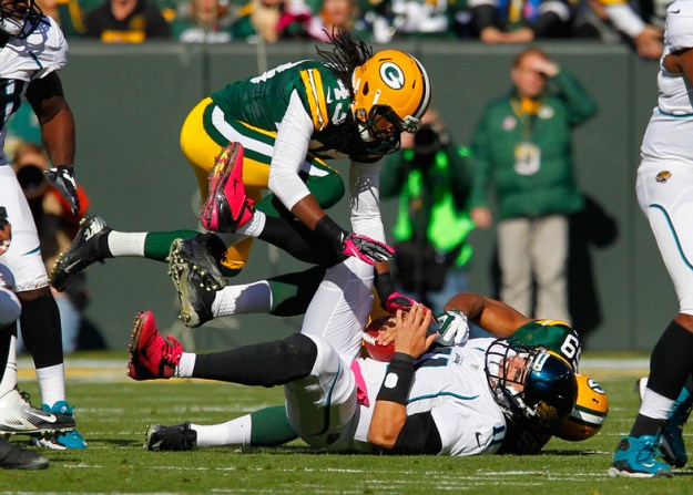 Green Bay Packers linebacker Brad Jones (59) and strong safety M.D. Jennings (43) sack Jacksonville Jaguars quarterback Blaine Gabbert.