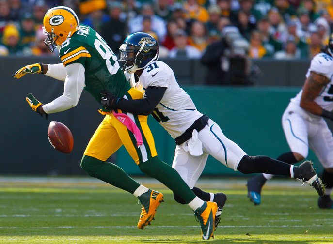 Green Bay Packers tight end Jermichael Finley drops a pass while being covered by Jacksonville Jaguars cornerback Aaron Ross.