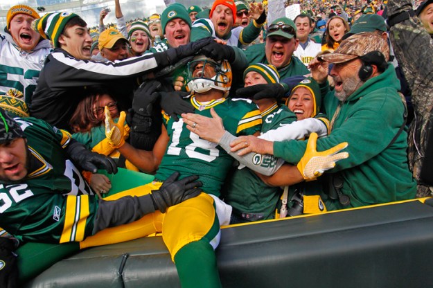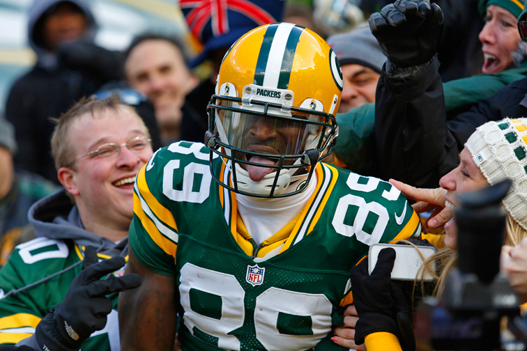 Green Bay Packers wide receiver James Jones celebrates scoring a touchdown against the Arizona Cardinals by performing a Lambeau Leap.