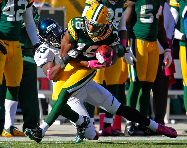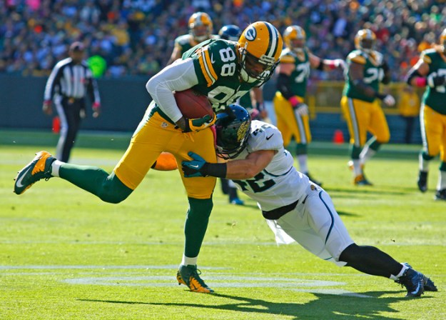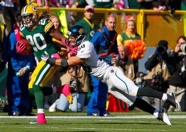 Green Bay Packers wide receiver Randall Cobb is taken down by Jacksonville Jaguars defensive back Chris Harris.