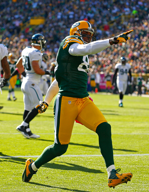 Green Bay Packers tight end Jermichael Finley celebrates a first down against the Jacksonville Jaguars.
