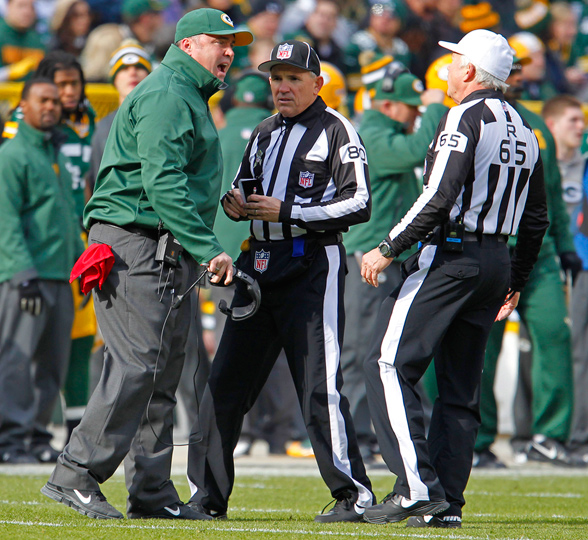 Green Bay Packers head coach Mike McCarthy yells to officials after a play against the Arizona Cardinals.