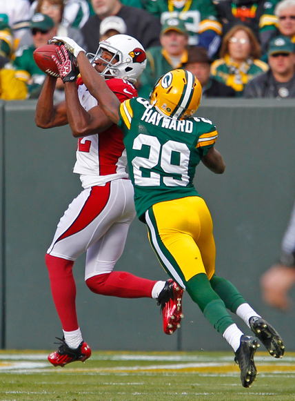Arizona Cardinals wide receiver Andre Roberts makes a catch while being covered by Green Bay Packers cornerback Casey Hayward.