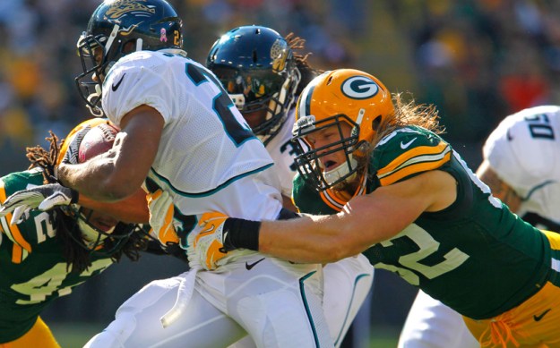 Green Bay Packers outside linebacker Clay Matthews tackles Jacksonville Jaguars running back Rashad Jennings.