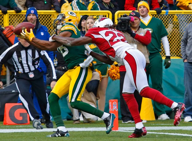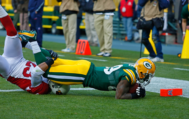 Green Bay Packers wide receiver Randall Cobb scores a touchdown while being covered by Arizona Cardinals cornerback William Gay.