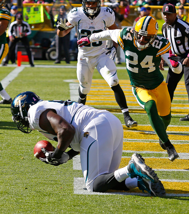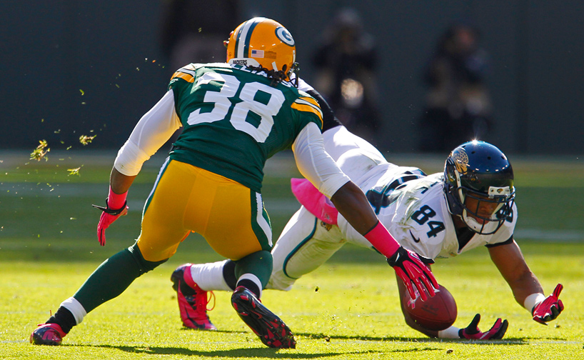 Jacksonville Jaguars wide receiver Cecil Shorts dives to try to make a catch while being covered by Green Bay Packers cornerback Tramon Williams.