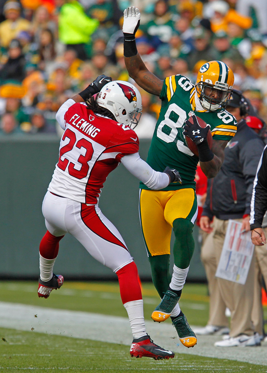 Green Bay Packers wide receiver James Jones is pushed out of bounds by Arizona Cardinals cornerback Jamell Fleming.