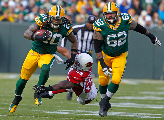 Green Bay Packers running back Alex Green runs through an attempted tackle by Arizona Cardinals inside linebacker Daryl Washington.