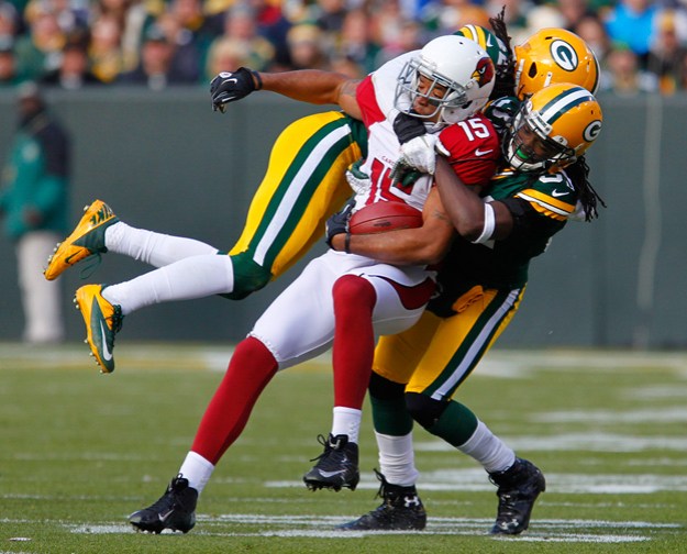 Arizona Cardinals wide receiver Michael Floyd is hit by Green Bay Packers free safety Morgan Burnett (42) and cornerback Davon House (31) .